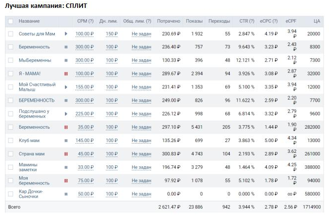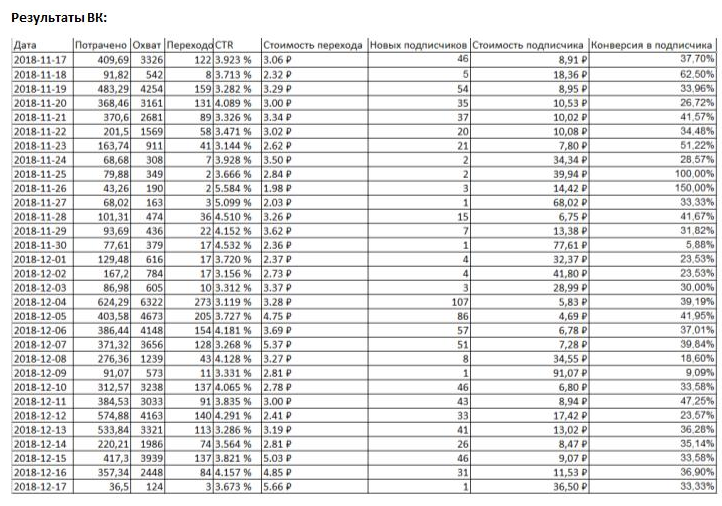Результат: получено 2 852 новых подписчика по 10 рублей, 3 лида по 114,6 рублей